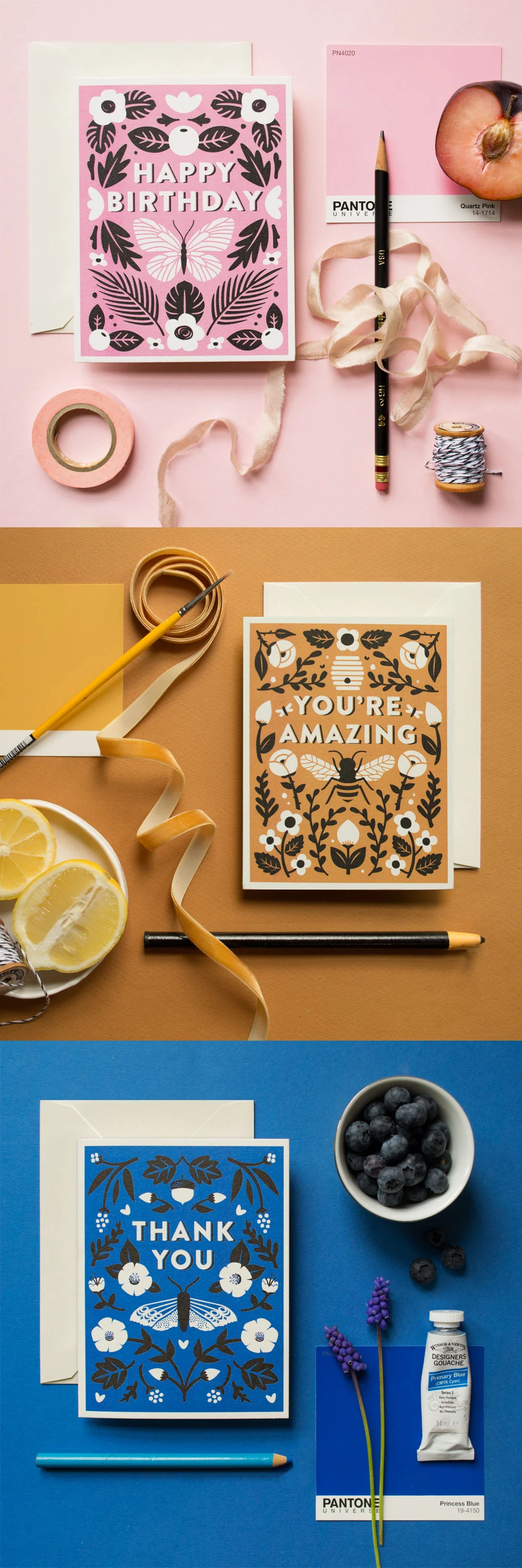 One of our favorites of all this "newness" are these Botanical Cards. Each of them feature different sentiments, a variety of flora, and their own delicate winged insect (the pretty kind, not the fall-on-you-in-the-shower-and-freak-you-the-crap-out or the chase-you-around-a-family-picnic-while-you-scream-like-an-8-year-old kind).